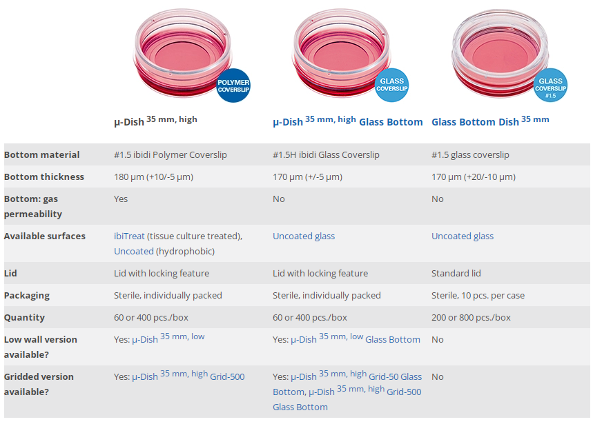 The μ-Dish 35 mm, high comes with a thin ibidi Polymer Coverslip Bottom that has the highest optical quality (comparable to glass) and is ideally suitable for high-resolution microscopy. It is also available with a #1.5H Glass Coverslip Bottom for TIRF or single molecule microscopy.