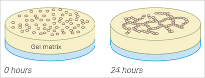 When using less than 10 μl of gel to fill the inner well of the μ-Plate Angiogenesis 96 Well, small numbers of cells can be cultivated and focused on a soft gel surface.