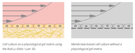 A cell monolayer is seeded on a hydrogel and defined shear stress can be applied. Being compatible with all pipettable gel matrices, the μ-Slide I Luer 3D allows a wide variety of polarization studies (e.g., with epithelial cells).