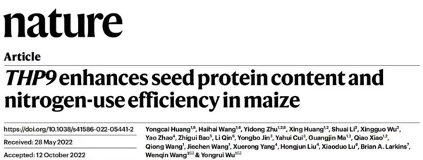 北京時間2022年11月17日,中國科學院分子植物科學****中心巫永睿研究團隊與上海師范大學王文琴研究團隊合作在Nature上發表了題為 “THP9 enhances seed protein content and nitrogen-use efficiency in maize”的研究論文。