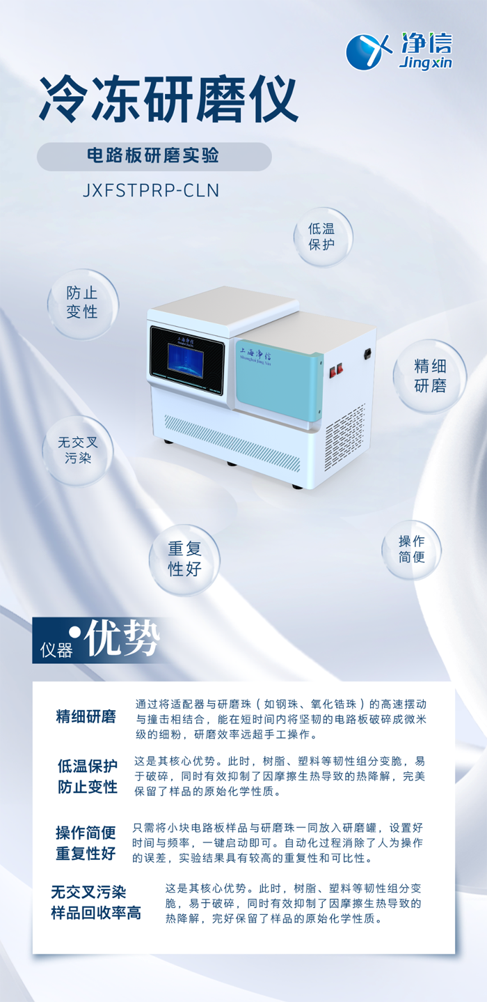 凈信冷凍研磨儀憑借其低溫、避免污染的研磨特性,成功解決了電路板這類復雜復合材料的前處理難題。它不僅是提升RoHS檢測、材料成分分析等數據準確性的“得力助手”,也是在電子廢棄物資源回收領域進行物料分析的“神兵利器”。選擇凈信冷凍研磨儀,意味著選擇了一條通往更可靠實驗結果的捷徑,為您的科研與質控工作提供了強有力的技術保障。