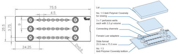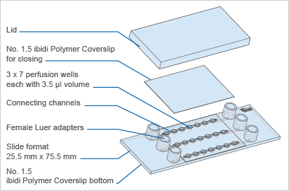 μ-Slide球體灌注是用于培養(yǎng)自由漂浮的3D聚集體的專用流動室。它由3 x 7平底孔組成,這些孔通過上方的通道連接。每個孔形成自己的壁,在此培養(yǎng)標(biāo)本。