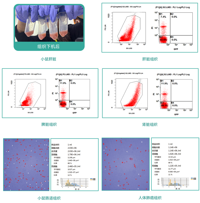 樣品通過(guò)雙向的機(jī)械切割與消化酶混合作用,通過(guò)恒溫消化,組織剪切,得到高濃度的活細(xì)胞懸液。后續(xù)經(jīng)過(guò)消化終止,過(guò)濾洗滌,必要時(shí)加以紅細(xì)胞裂解等步驟,可得到千萬(wàn)到百萬(wàn)級(jí)別的活細(xì)胞,不同的組織均可以達(dá)到90%以上的細(xì)胞得率。