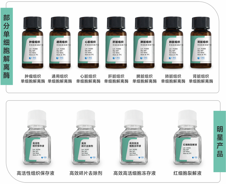 上海凈信推出了一系列針對不同組織的特異性單細胞解離酶,專為高質(zhì)量單細胞懸液制備而設(shè)計。產(chǎn)品采用了高純度、多元化酶配方,可快速、溫和解離組織樣本,最大限度保持細胞活性和完整性,適用于各類原代細胞提取、培養(yǎng)、流式分析、類器官、腫瘤組織解離及單細胞測序等研究。